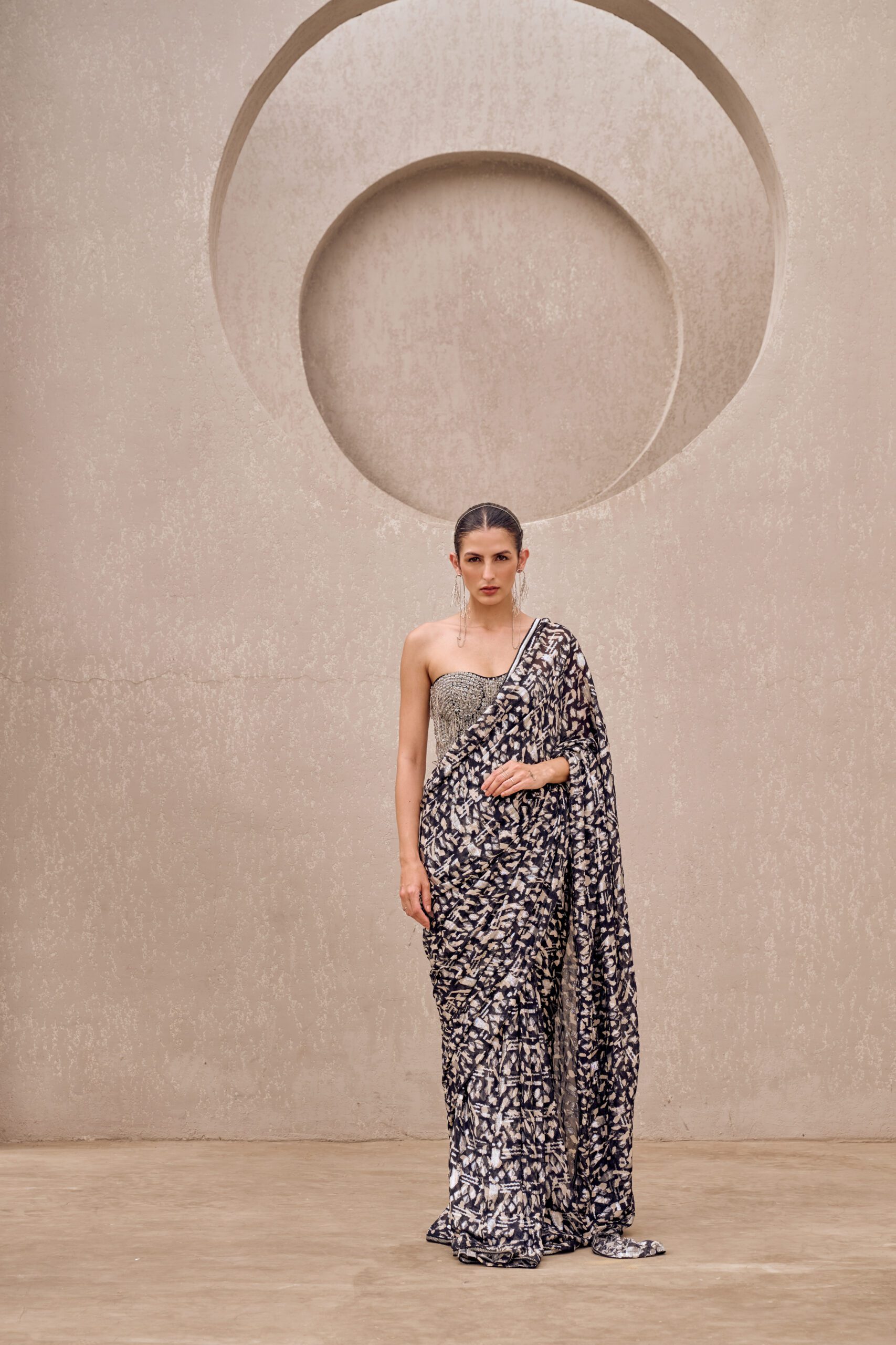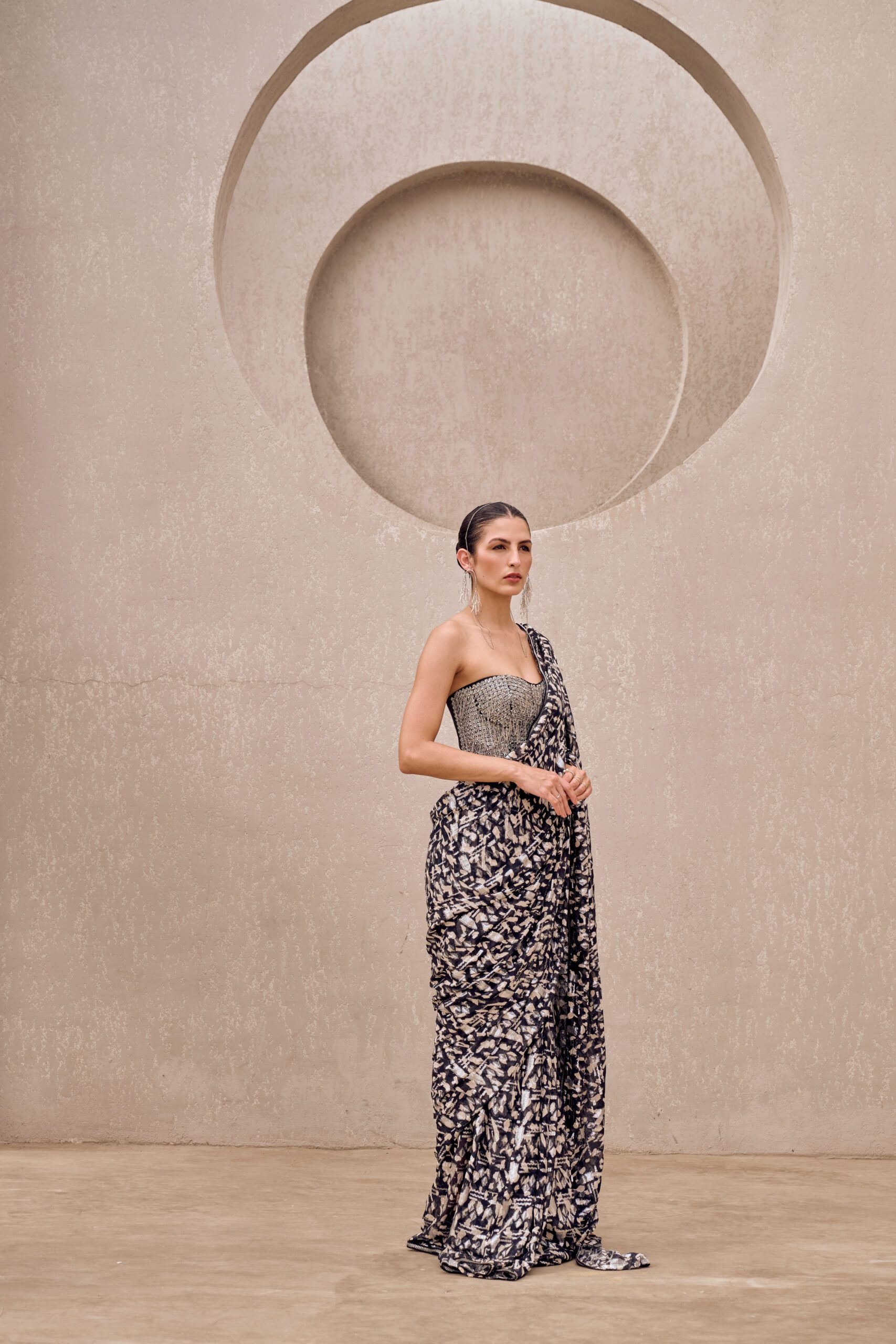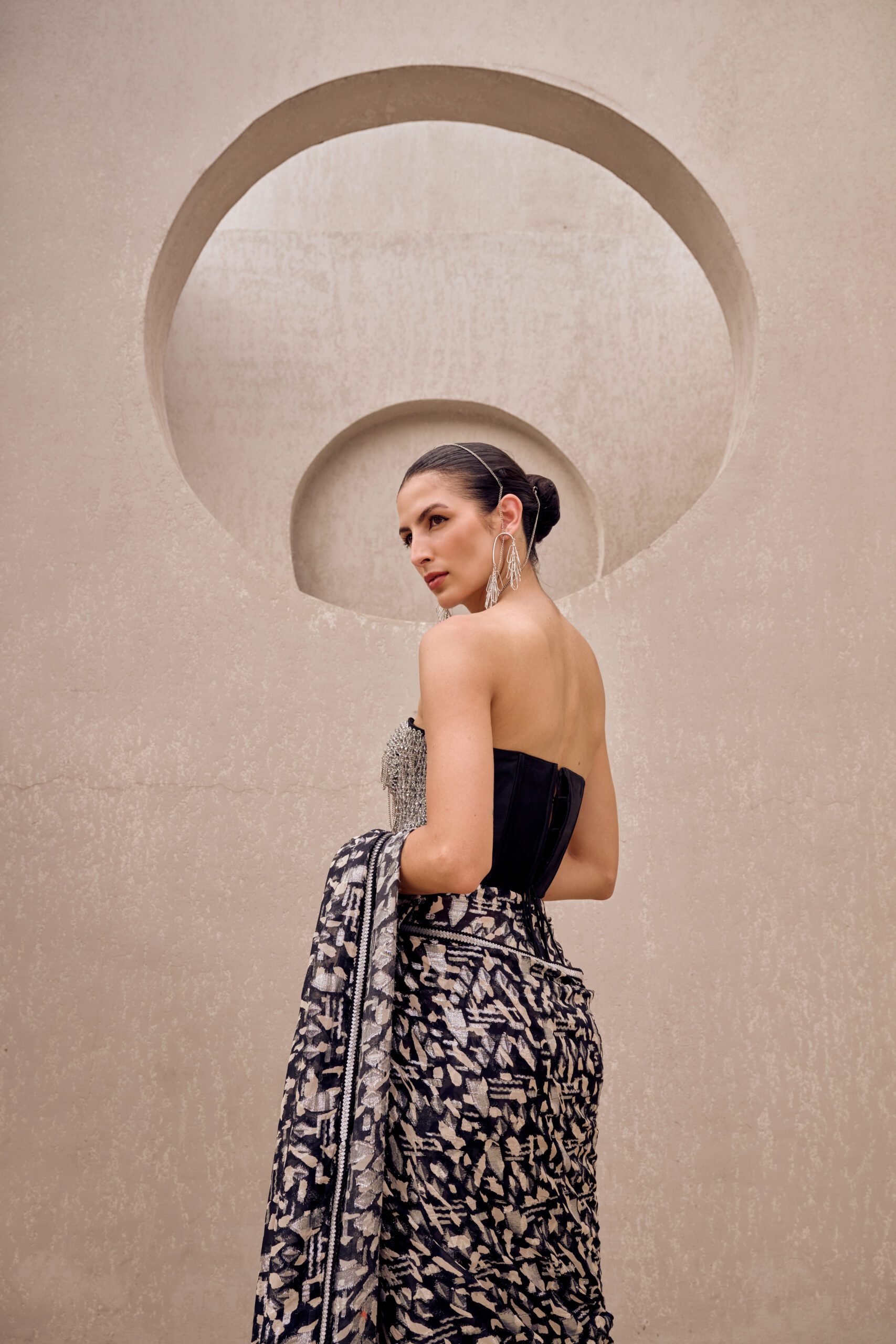 A chic black and silver titch button embroidered corset, designed with fine craftsmanship and paired elegantly with a saree. This ensemble beautifully balances modern edge with traditional grace, making it a statement outfit.