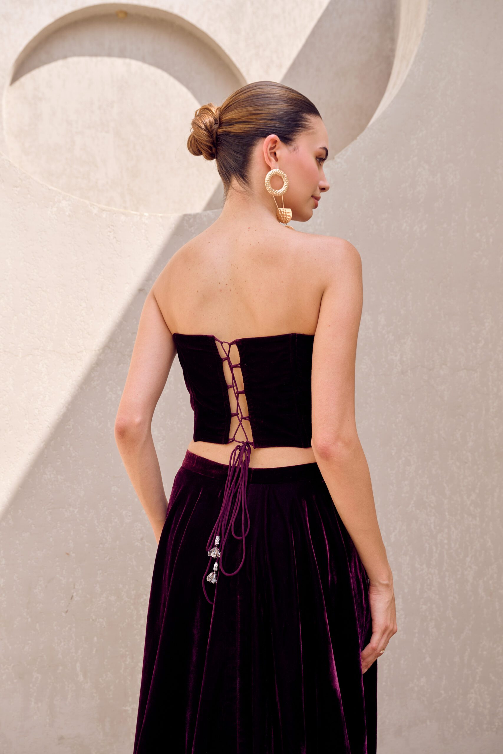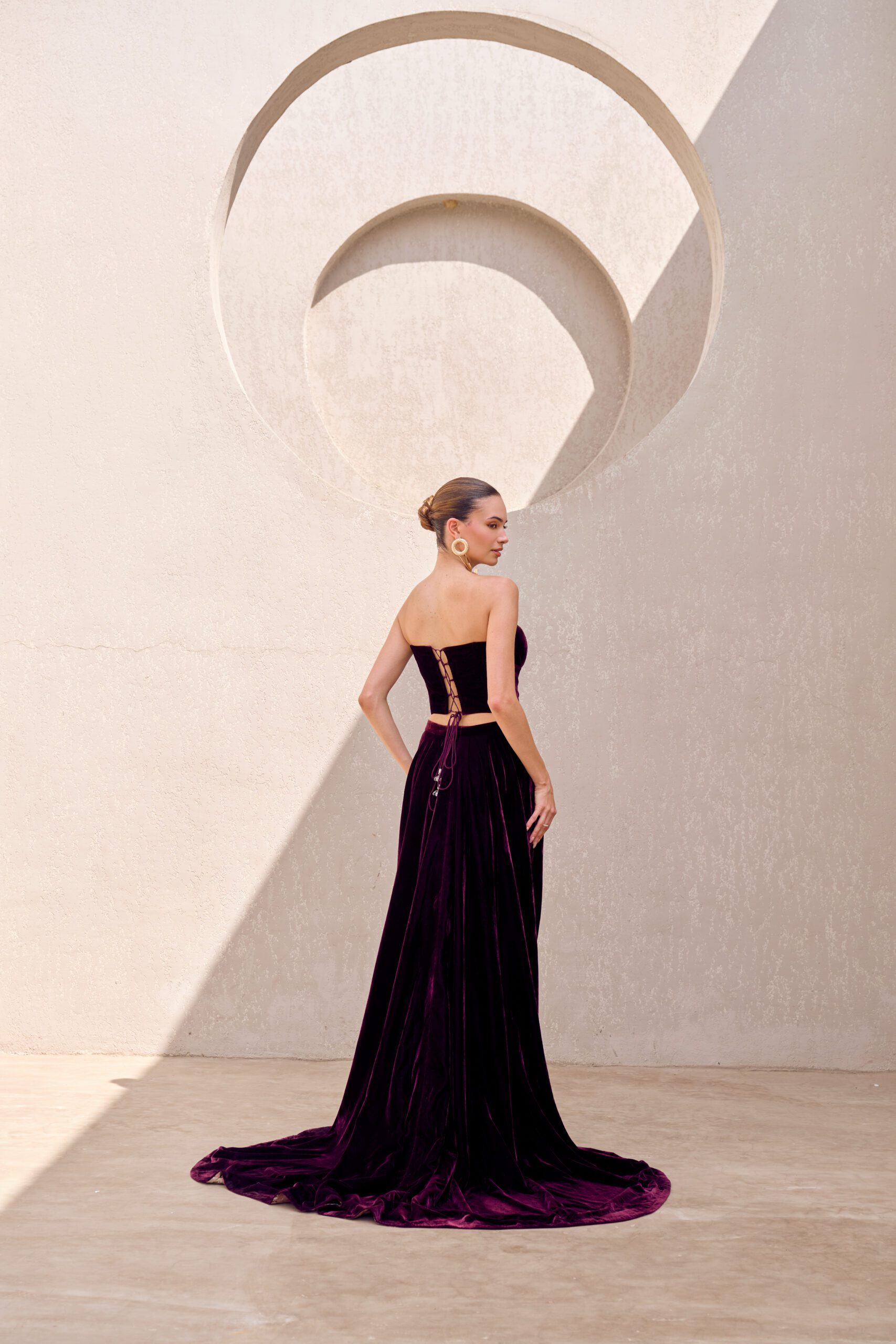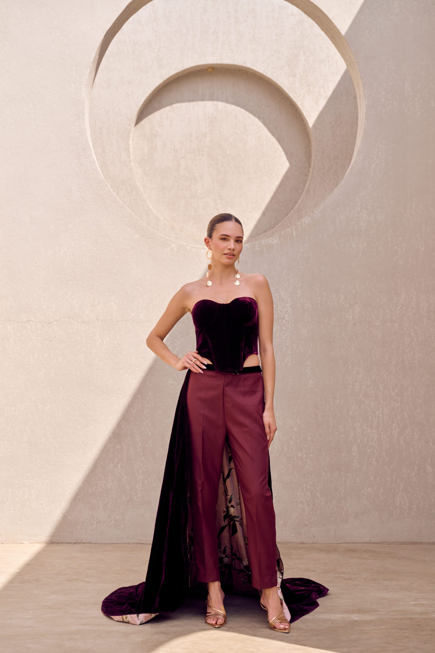 Make a statement in our burgundy velvet corset paired with matching pants and a detachable skirt with trail. Crafted for elegance and versatility, this ensemble is available on order in any size and any color.