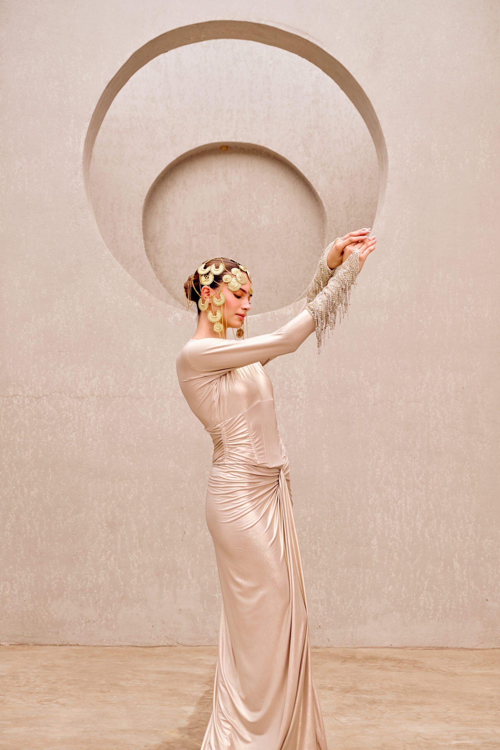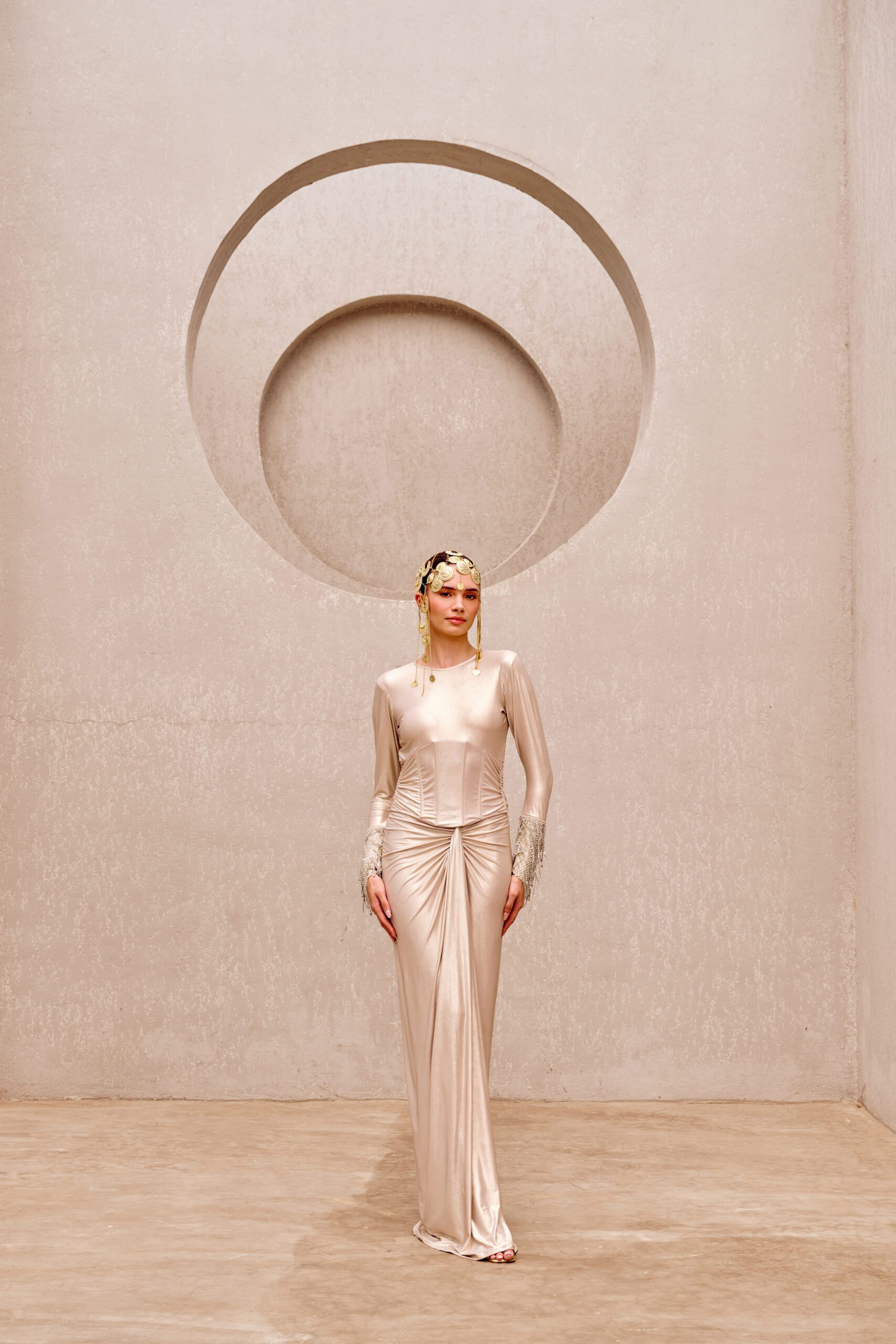Glow in our gold shimmer lycra corset top dress featuring jewelled cups, elegantly paired with a draped skirt. Designed to blend modern glamour with timeless elegance, this ensemble is available on order in any size and any color.
