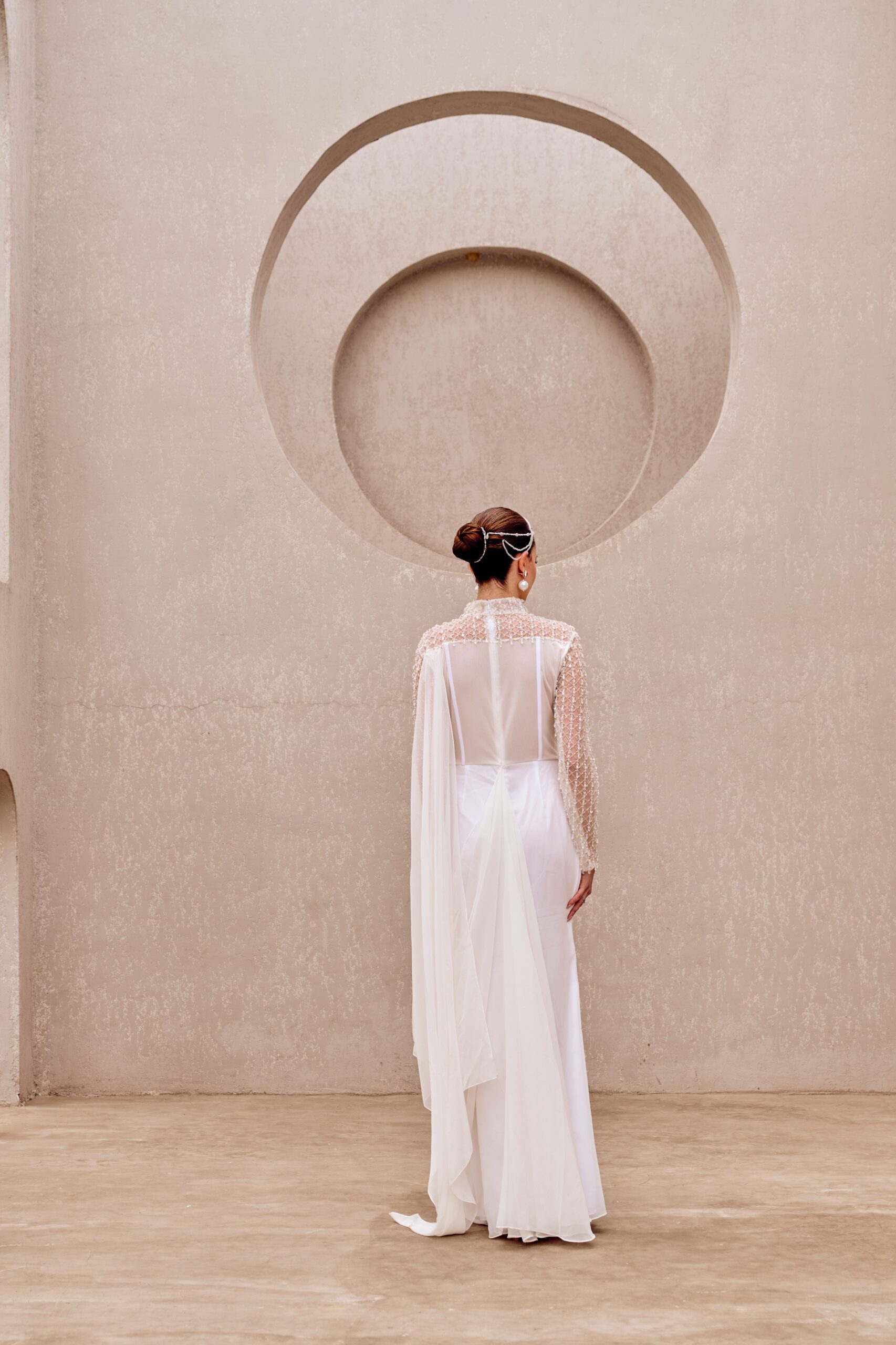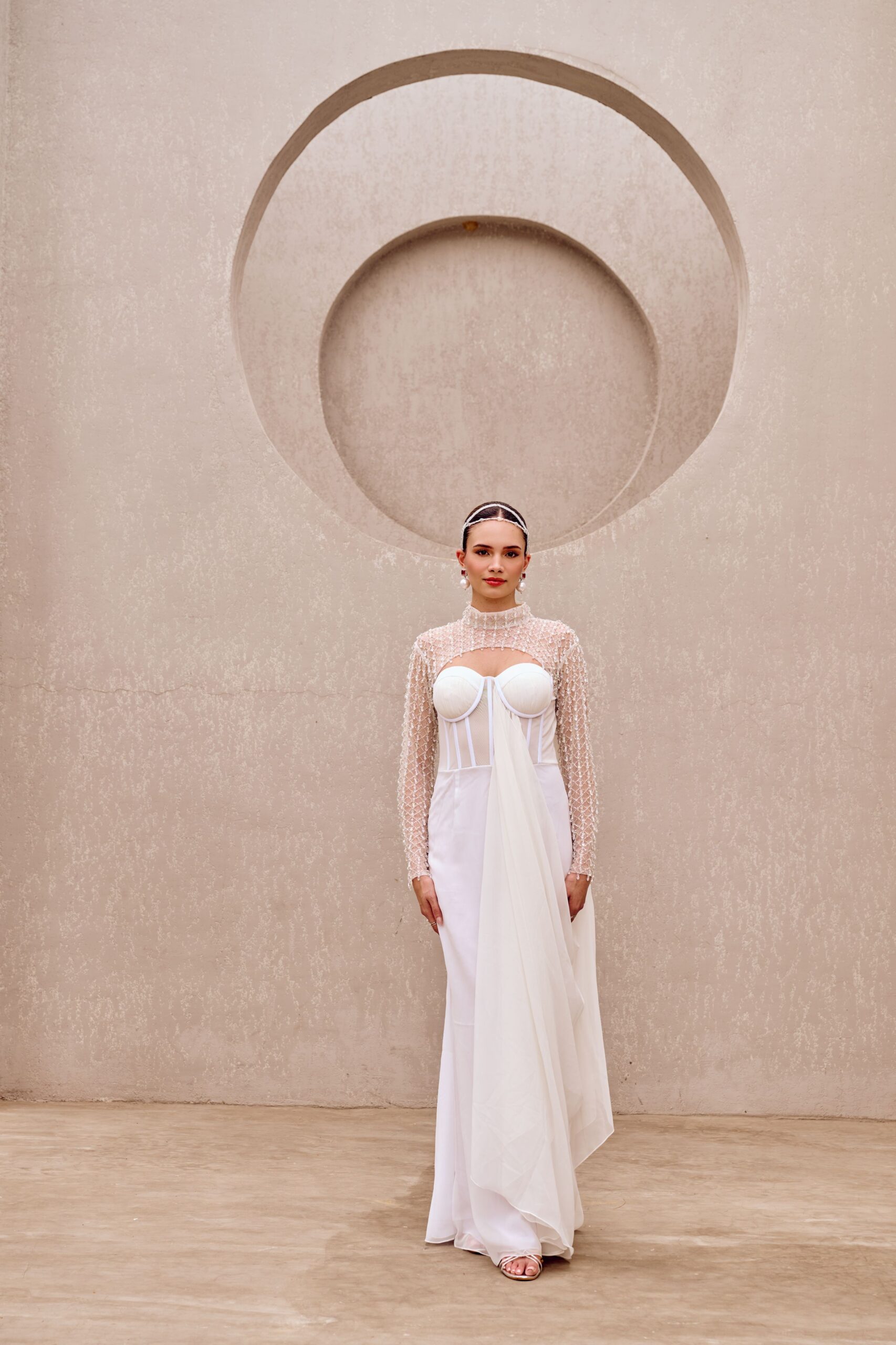 Exude grace in our pearl white hand-embroidered corset draped gown saree, meticulously crafted for a sophisticated and elegant look. Available on order in any size and any color, tailored perfectly to your style.